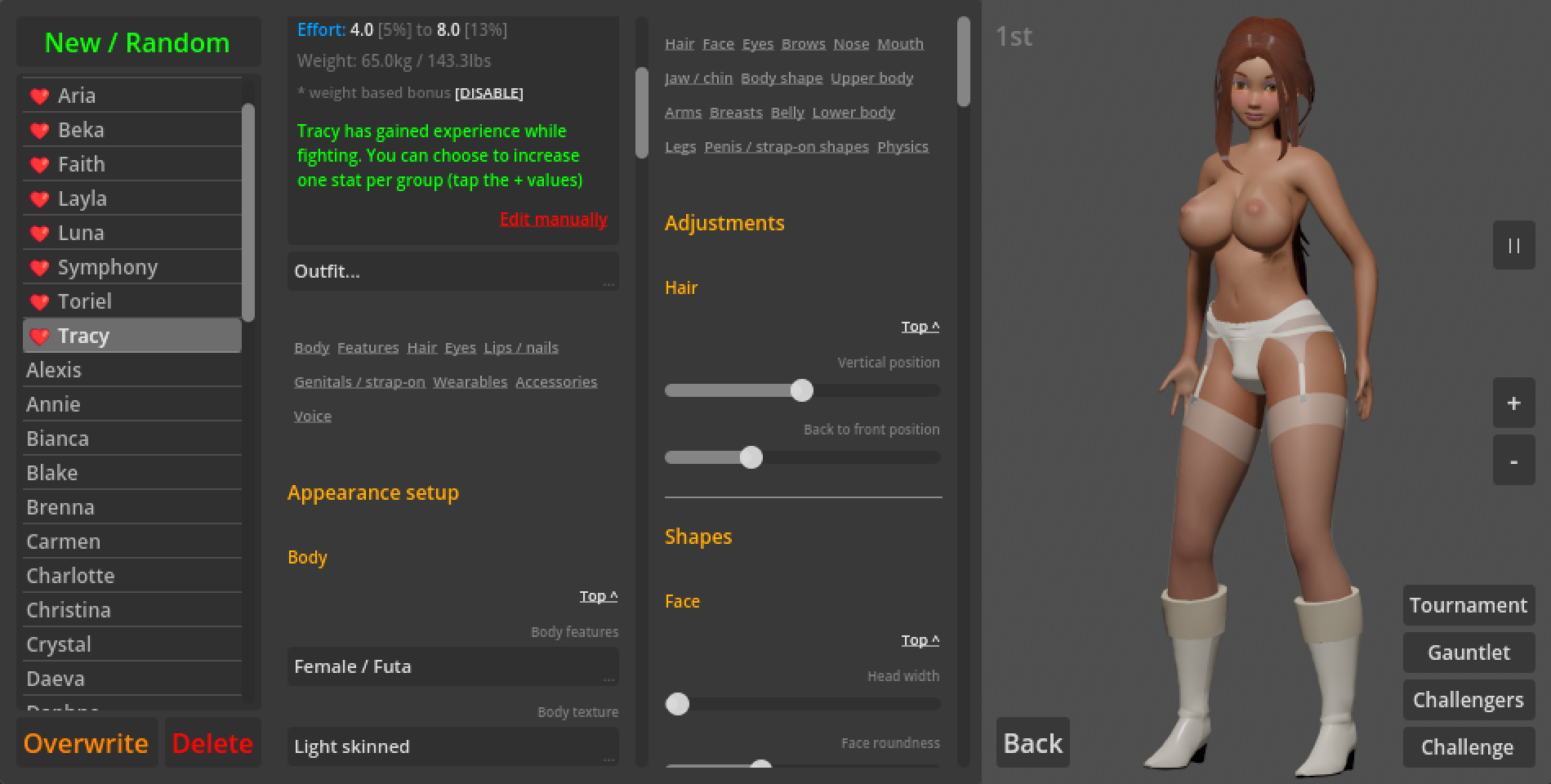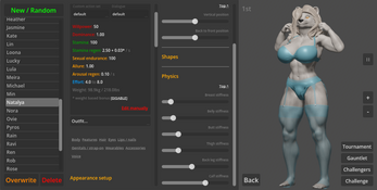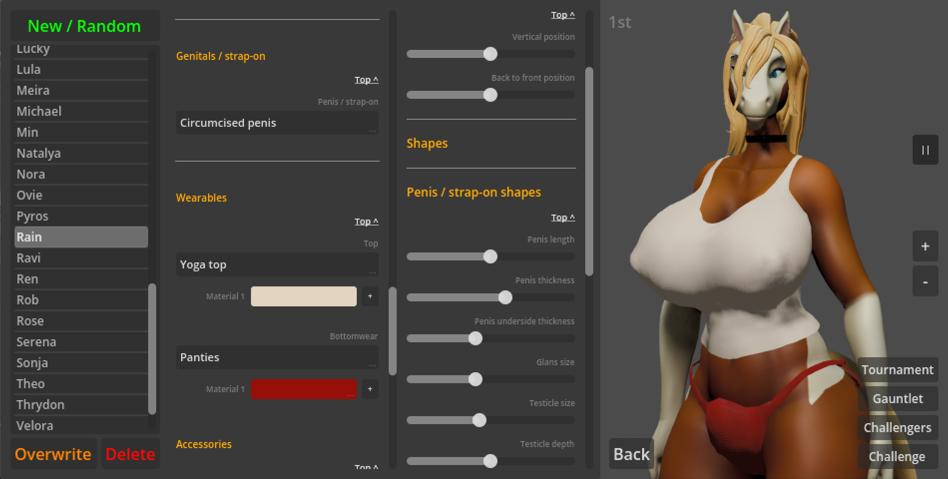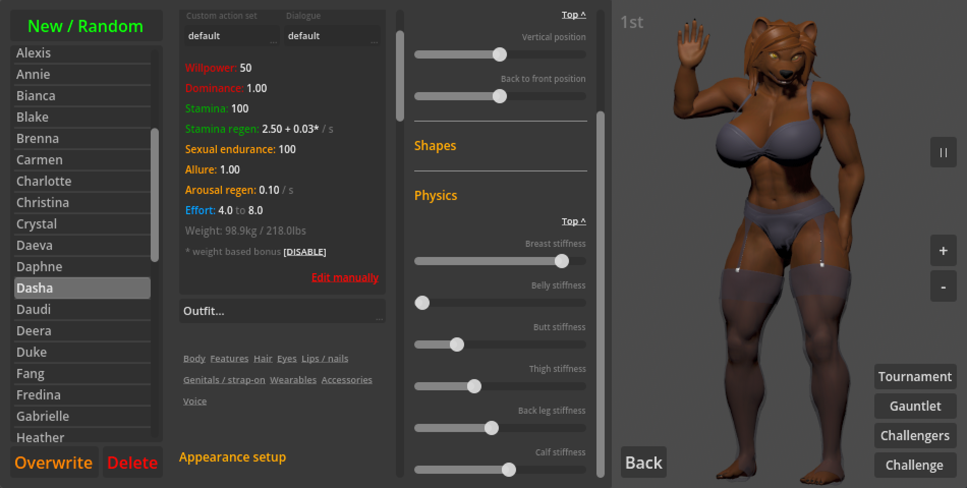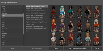 Sorry, I completely missed the notification for your comment. Yes, you should be able to (probably minus some clothing, since the tops don't really map well over a model with no breasts - that will probably be fixed in time though), especially with the latest version that adds new body types. You can play any way you want, there are some predefined characters, but you can either edit or delete them, and you always get to pick your opponent.