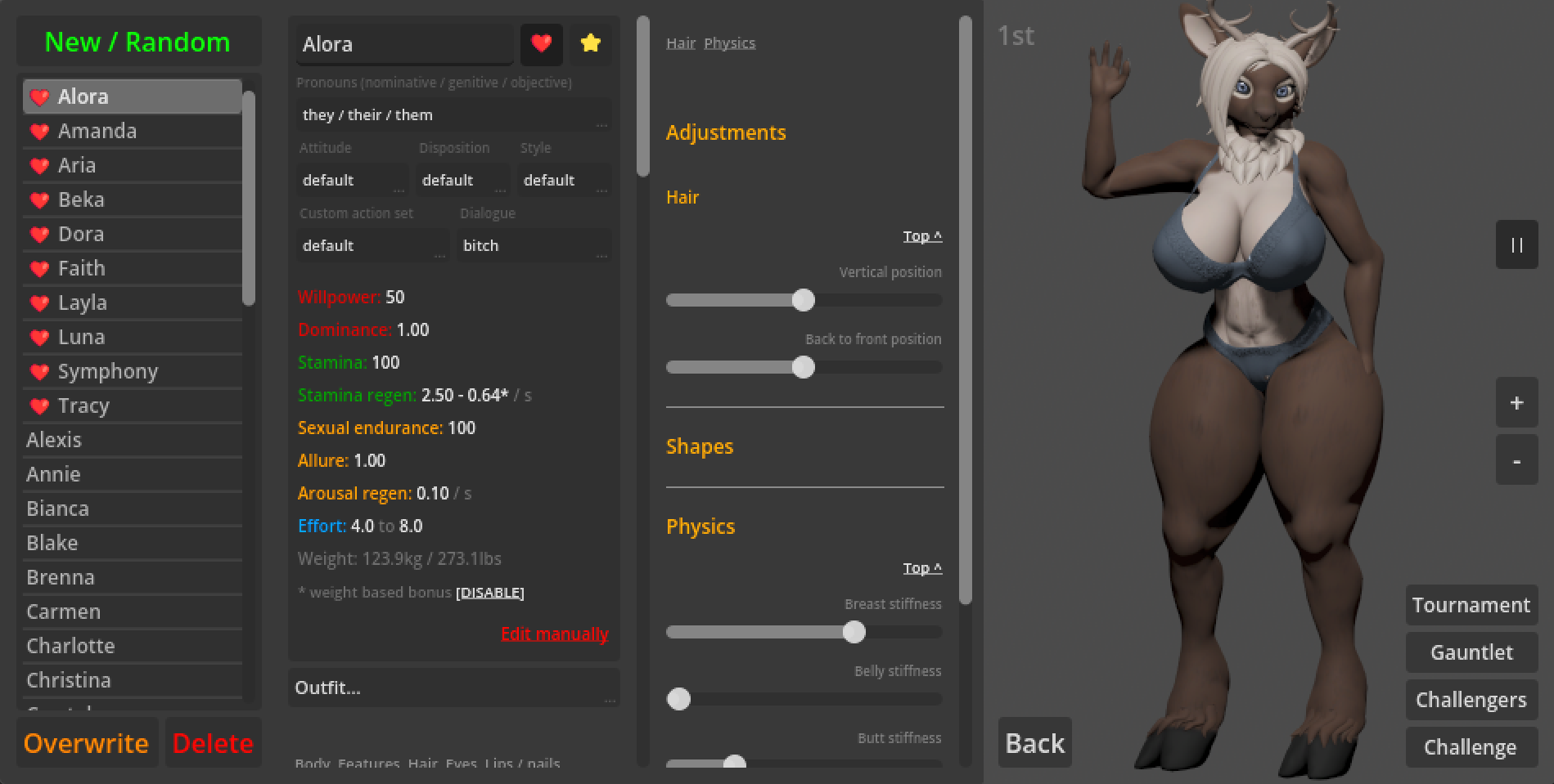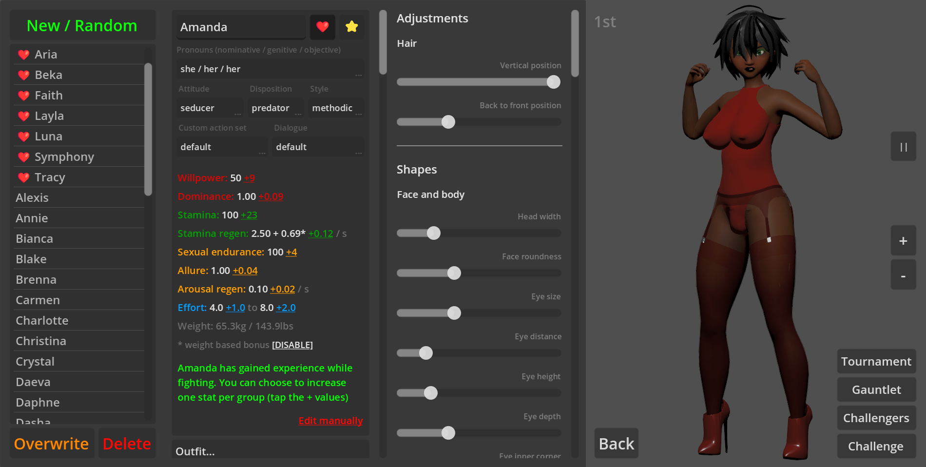 - The game also features hidden stats like Dominance (willpower damage multiplier) and Allure (arousal damage multiplier)